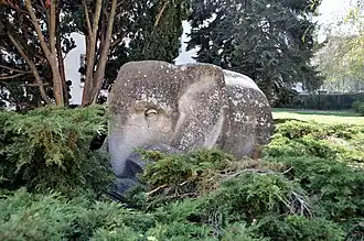 Natursteinplastik eines liegenden Elefanten in der Grünanlage des Vier-Jahreszeiten-Hof.[9]