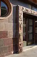 Zwei Natursteinreliefs mit Darstellungen von spielenden Kindern und Delfinen an einer Hausfassade.[10]