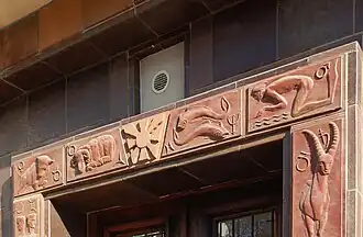 Zwei Keramikreliefs mit Tierdarstellungen im Margarethe-Trappl-Hof.[11]