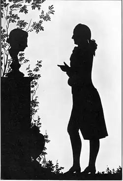 Es gibt einen Scherenschnitt um 1780, bei dem Goethe vor einem Grabmal mit der Büste einer jungen Frau steht. Diese Büste wiederum wurde mit Christel von Laßberg in Verbindung gebracht, jedoch ohne dass sie ihr sicher zuzuweisen gewesen wäre.[18][19][20] Das Original dieses Scherenschnittes wiederum befindet sich im Schloss Tiefurt. Hans Wahl und Anton Kippenberg bezeichnen sie als Eine der schönsten Silhouetten dieser Kunst.[21] Dass die Herausgeber das auch wirklich meinten, beweist gewiss auch die Tatsache, dass sie die Vorderseite des Schutzumschlages dieses Bandes mit eben dieser Silhouette versehen hatten.