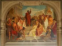 Die Aula wird im Inneren von ionischen und korinthischen Säulen getragen. An der Ostseite befindet sich eine Bühne, auf der Westseite ein Balkon, auf den heute die Bühnentechnik untergebracht ist. Beleuchtet wird der Raum durch mehrere prächtige Kronleuchter. Zentrales Gestaltungselement der Aula ist das acht mal sechs Meter große Wandgemälde Paulus predigt in Athen, das zwischen 1872 und 1877 von sächsischen Künstler Anton Dietrich geschaffen wurde. Die dargestellte Szene basiert auf der Apostelgeschichte (Kapitel 17, Vers 22 und 23) und fügt sich mit seiner Symbolik in die christlich-humanistische Tradition des Gymnasiums ein. Dieses Bild der Neorenaissance gilt als bedeutendstes Werk der Historienmalerei der Dresdner Schule des 19. Jahrhunderts. Das Gemälde wird von einem griechisch-klassischen Bogen eingefasst und wird von vier allegorischen Figuren und drei Grisaillebildern umgeben. Auf ihnen sind die großen Denker ihrer Zeit dargestellt – Homer, Aristoteles, Martin Luther, Philipp Melanchthon, Johann Wolfgang von Goethe, Alexander von Humboldt.