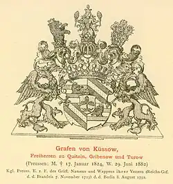 Sein Vetter Erasmus Ernst Friedrich von Küssow, kurtrierscher Kammerherr, hatte 1723 ein Reichsgrafendiplom und 1724 ein schwedisches Grafendiplom erwirkt. Als 1752 die hinterpommerschen Küssows eine preußische Anerkennung des Grafenstandes erwirkten,[1] galt diese Anerkennung auch für Christian Friedrich von Küssow, nunmehr Christian Friedrich Graf von Küssow.