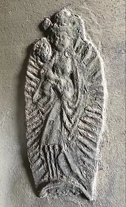 Zwischen Anfang und Ende der Inschrift ist in einem Medaillon Maria mit dem Kinde abgebildet.