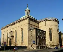 Das Gebäude selbst ist ein Zentralbau auf quadratischem Grundriss, der von einer schlichten Kuppel (Pendentifkuppel mit niedrigem Tambour) mit Laterne bekrönt wird. Im Norden ist dem Hauptraum ein schmalerer Portalbereich vorgesetzt. Die Nordfassade mit dem Haupteingang nimmt eine große Freitreppe und eine Kolonnade nach einem Entwurf von Xawery Dunikowski ein. Der Chorabschluss im Süden ist halbkreisförmig.