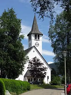Das Kirchengebäude besteht aus dem mit einem Satteldach gedeckten Langhaus, dem eingezogenen und etwas geringer hohen Chor mit angebauter Sakristei und dem 42 Meter hohen Turm mit quadratischem Grundriss und achteckigem, unten abgeknickten Spitzhelm. Die Westfassade ist, abgesehen vom durch eine kleine Vorhalle geschützten Haupteingang und vier kleinen schlitzartigen Fensteröffnungen, vollständig geschlossen. Der Turm ist auf der Südseite an das Kirchenschiff unmittelbar vor dem Chor angebaut.