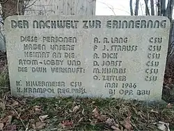 1989 nach massivem Widerstand und teils bürgerkriegsähnlichen Protesten[45] gab die CSU den Bau der Wiederaufarbeitungsanlage Wackersdorf (WAA) auf. Bis Anfang 2011 lehnte die CSU einen Atomausstieg ab und befürwortete die Nutzung der Kernenergie; 2010 beschloss sie in der Schwarz-Gelben Koalition die Laufzeitverlängerung deutscher Kernkraftwerke mit. Nach der Nuklearkatastrophe von Fukushima 2011 wurde diese langjährige Position aufgegeben. Die CSU strebte nun an, die Nutzung der Kernkraft „so schnell wie vernünftigerweise möglich“ zu beenden. Der Ausstieg aus der Kernenergie-Nutzung sollte spätestens bis zum Jahr 2022 erreicht werden. Außerdem strebt die Partei an, dass in Bayern bis 2020 50 % des Stroms aus Erneuerbaren Energiequellen stammen soll.[46] Die 10H-Regelung 2014 von Horst Seehofer bringt aber den Windkraftausbau in Bayern praktisch zum Erliegen.[47][48] Der beschleunigte Ausstieg aus der Kernenergie wird zwar als große Herausforderung gesehen, allerdings wird seitens der Partei auch betont, dass nach Ansicht der CSU die Zukunft ökologischen Technologien gehöre.[49] Die Ökosteuer wird zwar grundsätzlich abgelehnt, auf die Forderung nach Abschaffung aber seit dem Wahlprogramm 2005 verzichtet. In der Hochwasser- und Klimapolitik investiert Bayern seit einigen Jahren zunehmend.