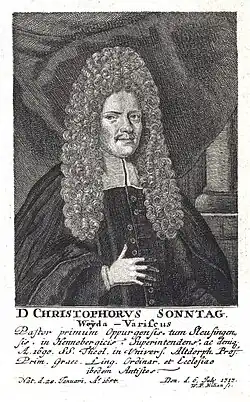 - ↑ Taufeintrag Kirchenbuch Weida 1633-1655, fol 36b: Christoph, Sohn des Christianus Sontag getauft 29. Januar 1654, Nachtrag in roter Tinte: den 6. März (!) 1717 als Professor und D. der Chron gestorben', Taufpaten: Herr Friedrich Rost, Landrichter; Herrn Valerius Sontags Weib und Christoph Nürnberger