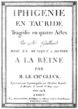 - Iphigénie en Aulide, Libretto: François-Louis Gand Le Bland Du Roullet nach Jean Racine, Uraufführung: Paris, 19. April 1774; mit Sophie Arnould in der Titelrolle