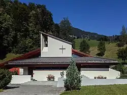 Das Kirchengebäude steht zurückgesetzt von der Strasse und fügt sich unspektakulär in die lokalen Bauten ein. Die einzelnen Bauelemente Kirchenschiff, Glockenturm, Wohnbereich und Eingangszone sind versetzt aneinander gebaut und werden von einem flachwinkligen Satteldach überdeckt. Der niedrige Turm übernimmt mit seinem Pultdach die Neigung der übrigen Dachfläche. Über dem weiss verputzten Mauerwerk ist ein umlaufendes Fensterband, über dem das weit vorspringende Dach anschliesst.