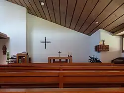 Der Innenraum enthält die blockförmig angeordneten Kirchenbänke und den eingezogenen Chorbereich. Die Decke überspannt entsprechend der Dachneigung den Raum. Tageslicht kommt durch die Fenster der Wände und von oben ausgesparten Spickeln in der Giebelwand und beim Turm. Der Altar und der Ambo sind aus blockverzinkten Holzelementen und mit kreuzartigem Unterbau versteift. Der mit Eisenbändern verstärkte Tabernakel ist in die rechte Mauerecke eingefügt. Die schmiedeeisernen Ausstattungsteile wurden vom Sarner Kunstschmied Bruno Imfeld (1944–2017) geschaffen.