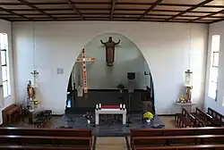 Nach dem Konzept einer Wegekirche wurden die liturgischen Orte des Raums auf den Altarraum, der ein einheitliches Niveau erhielt, hin ausgerichtet. Mittig unter dem Parabelbogen befindet sich der Altar, in dessen Achse, mittig im Kirchenschiff, sich der Taufstein befindet. Der Tabernakel fand seinen Platz in einer Art Sakramentskapelle.