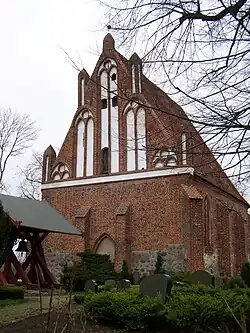 Nachdem der Kirchturm abgerissen war, gestalteten Handwerker die Westfassade neu. Mittig ist eine zugesetzte, spitzbogenförmige Blende, in der zuvor der Durchgang zum Turm war. Das untere Drittel der Wand besteht aus Feldsteinen, darüber kamen wiederum Mauersteine zum Einsatz. Oberhalb einer rechteckigen, hell verputzten Blende erhebt sich ein prächtig gestalteter Staffelgiebel. Er besteht aus drei mehrteiligen und gekuppelten Blenden, die seitlich von weiteren Blendenfeldern ergänzt werden. Zusätzlich schmücken vier Fialen den Giebel, der mit Turmkugel und Wetterfahne abschließt.
