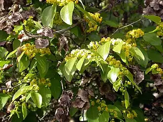 Die kleinen, 3–6 mm großen, kaum duftenden, zwittrigen und gelben Blüten bilden vielblütige Trugdolden und zeigen die charakteristischen Merkmale der Kreuzdorngewächse, sie sind fünfzählig, kurzgestielt und achselständig mit doppelter Blütenhülle. Die fünf breit-eiförmigen und spitzigen, innseitig gekielten und außen flaumig behaarten Sepalen umschließen eine flache, fleischige Nektarscheibe in deren Mitte das Gynoeceum sitzt. Die schmalen, spatel- und kapuzenförmig Petalen sitzen am Rand des zehnlappigen Diskusses zwischen den Sepalen und umgeben rückseitig jeweils die einzelnen und etwas kürzeren Staubblätter mit hellbraunen Antheren. Die Staubblätter und die Petalen biegen sich später in der Entwicklung nach außen. Der zwei bis dreifächerige Fruchtknoten ist halbunterständig und trägt einen zwei bis dreiästigen Griffel.