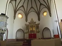 Die Innenausstattung erweckt durch eine bewusste Mischung von Stilformen einen historisch gewachsenen Eindruck. Altar und Empore sind weitgehend im Originalzustand erhalten. Die Gestaltung der Empore stammt im Wesentlichen von Gotthold Riegelmann (Sandstein-Konsolen) und Max Kutschmann (Emporenbrüstung und Orgelprospekt). Durch Kutschmann wurde auch der mittelalterlichen Flügelaltaren nachempfundene Altar bemalt. Im Mittelfeld ist der gekreuzigte Christus zu sehen, dessen Kreuz vor einer goldenen Landschaft steht. Das mittlere Giebelfeld wird bekrönt von einem Pelikan. Der Pelikan symbolisiert die Liebe Gottes und die Erlösung durch den Opfertod. Die Seitenflügel des Altars zeigen Rankwerk. Im Turm hängen drei klangstarke Stahlgussglocken, die bereits 1908 zur Kirchweihe läuteten. Die Inschriften stammen aus Psalm 84,12 ; Hebräer 13,8 und Psalm 144,15 .