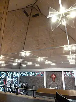 Unterhalb der Dachkonstruktion führt um die ganze Kirche ein Lichtband, das aus dicken Glassteinen gestaltet ist. Unterbrochen wird das Lichtband durch ein großes, bis zum Boden reichendes Tauffenster, vor dem der schlichte Taufstein steht.[2]