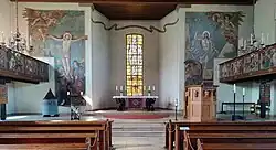 Links und rechts der Apsis befinden sich zwei große Wandgemälde von der Kreuzigung und Auferstehung Jesu. Die beiden Werke stammen von Günter Voglsamer und wurden erst 1947 nachträglich angefertigt.[3]