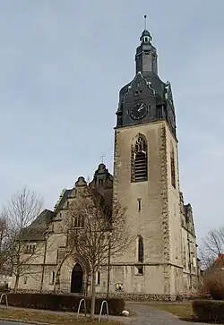 - ↑ a b Äußerlich verwandt mit dem Rathaus. Weihe der Wittenberger Kirche vor 80 Jahren. In: Neue Zeit, 23. November 1988, S. 3.