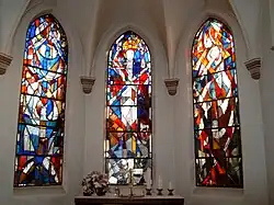 Der Innenraum ist schlicht gestaltet. Das Deckengewölbe und die Fenster sind neugotisch geprägt, während die Prieche über dem Eingangsbereich klassizistisch ist. Der Chorraum ist mit drei großen und auffälligen Buntglasfenstern ausgestattet.[2]