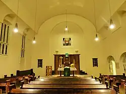 Die 1910/12 errichtete Christuskirche ist das Erstlingswerk von Julius Schulte, das dieser 1907/8 als Schülerarbeit bei Friedrich Ohmann in Formen des späten Jugendstils mit secessionistischen Details und barockisierenden Elementen entworfen hatte. Das Bauwerk ist ein mit Walmdach gedeckter Saalbau mit eingezogenem Turm, der in ein Oktogongeschoß übergeht und mit einer geschweiften Haube gedeckt ist. Die Seitenwände sind durch Pilaster gegliedert, das Innere ist tonnengewölbt. In Übereinstimmung mit dem 1891 verfassten Wiesbadener Programm besitzt die Kirche einen Kanzelaltar und statt eines Mittelgangs wie in einem Vorlesungssaal einen einheitlichen Gestühlsblock, der die Konzentration auf das gesprochene Wort fördern sollte. Die flache Wandnische darüber enthält das Majolikarelief "Lehrender Christus". Bei der Innenrestaurierung von 1987 wurde die Farbigkeit von 1914 wiederhergestellt, der Turmbau wurde 1994 restauriert.
