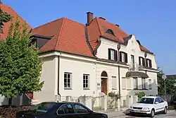 An den Kirchenbau schließt sich südseitig das Pfarrhaus als ein differenzierter barockisierender Baukörper mit Polygonalerker, Schweifgiebel und Mansarddach an.
