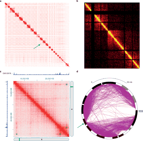 - ↑ Lieberman-Aiden E, van Berkum NL, Williams L, Imakaev M, Ragoczy T, Telling A, Amit I, Lajoie BR, Sabo PJ, Dorschner MO, Sandstrom R, Bernstein B, Bender MA, Groudine M, Gnirke A, Stamatoyannopoulos J, Mirny LA, Lander ES, Dekker J: Comprehensive mapping of long-range interactions reveals folding principles of the human genome. In: Science. 326. Jahrgang, Nr. 5950, Oktober 2009, S. 289–93, doi:10.1126/science.1181369, PMID 19815776, PMC 2858594 (freier Volltext), bibcode:2009Sci...326..289L.
