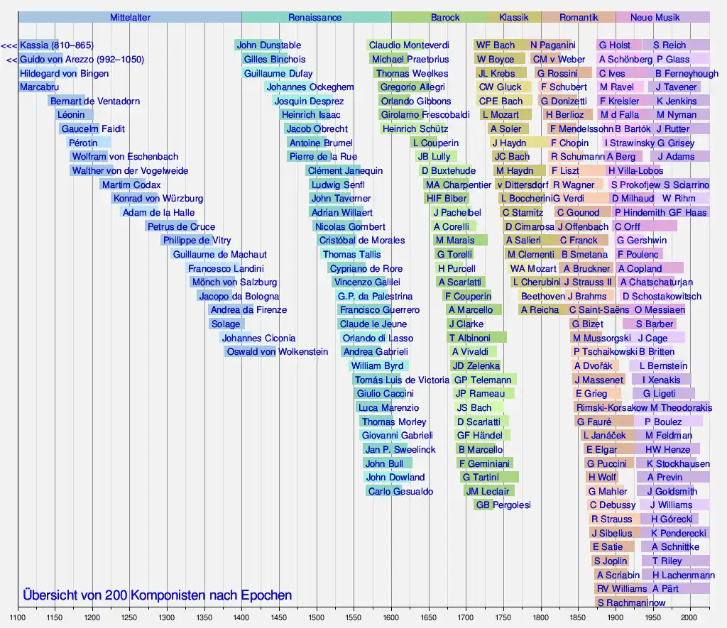 Siehe auch: Portal:Musik, Epochen der Musik, Musikgeschichte, Liste von Komponisten klassischer Musik, Liste der Listen von Komponisten nach Ländern geordnet, Liste von Komponistinnen, Liste von Jazz- und Improvisationsmusikerinnen