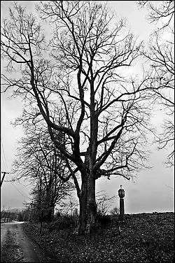 - Bildstock mit 35 cm hohem Kreuzaufsatz, vor der Ortseinfahrt von Žumberk unter einer hohen Linde (Baumdenkmal)