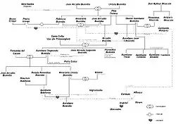 Arcadio: Der Sohn von José Arcadio und Pilar Ternera, wird Direktor der Schule des Dorfes. Während des Aufstands wird er zum Anführer von Macondo und entwickelt sich zu einem diktatorischen Herrscher. Er wird von den Konservativen getötet, als sie das Dorf zurückerobern. Er heiratet Santa Sofía de la Piedad und ist Vater von Remedios, Aureliano Segundo und José Arcadio Segundo.