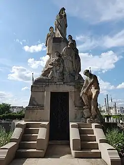 An einer zentralen Wegkreuzung des Friedhofs steht das Denkmal für die Toten des Ersten Weltkrieges. Das 1923 vom Architekt Henri Bertin und dem Bildhauer Yroudy errichtete Monument zeigt als Hauptfigurengruppe eine Frau umgeben von vier Soldaten. Die Frau als Symbol für die Mutter und Ehefrau ist als Trauernde mit gesenktem Kopf dargestellt, während ein sterbender Soldat zu ihr aufschaut. Am Sockel findet sich die Figur eines Arbeiters, der als Friedenssymbol ein Schwert zerbricht. Diese antimilitaristische Figur führte in den 1920er Jahren zu erheblichen Kontroversen. 1926 wurde die Figur mutwillig beschädigt und danach nicht wieder rekonstruiert.[2] Des Weiteren gibt es ein Grabfeld mit 29 Gräbern britischer Soldaten, das von der Commonwealth War Graves Commission betreut wird.[3] Zudem erinnert ein Monument an die Pariser Taxifahrer, die 1914 zur Verstärkung Soldaten an die Front gefahren haben. In Levallois-Perret waren seinerzeit zahlreiche Pariser Taxiunternehmen mit ihren Werkstätten ansässig. Auch an die im Krieg gestorbenen Angestellten der örtlichen Automobilindustrie erinnert ein Gedenkstein.[4]