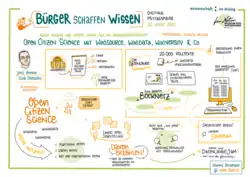 Seitdem hat die Bürgerforschung in Deutschland kontinuierlich an Bedeutung gewonnen und es entstanden zahlreiche weitere Projekte und Initiativen in verschiedenen Bereichen wie Klimaforschung, Biologie, Medizin und Geowissenschaften. Im Jahr 2014 startete die vom Bundesministerium für Bildung und Forschung geförderte Plattform "Bürger schaffen Wissen", welche die Zusammenarbeit zwischen Bürgerinnen und Bürgern und Forscherinnen und Forschern in Deutschland weiter fördern soll.[52] Das Projekt wird seit 2024 unter dem Namen mit:forschen! weitergeführt.[53] mit:forschen! bietet eine Übersicht über Citizen-Science-Projekte in Deutschland, Fortbildungsangebote für wissenschaftlich und multiplikatorisch arbeitende Personen, themenspezifische Arbeitsgruppen, einen Newsletter und eine Expert*innen-Datenbank über die vorhandene Expertise im Citizen Science-Bereich abgebildert wird.[54]