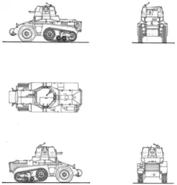 Die polnische Armee erwarb in den 1920er-Jahren etliche Citroën-Kégresse-Halbkettenfahrzeuge der Typen P4T, P14, P17 und P19, insgesamt 229 Stück.[43] Von den P4T erhielten etwa 90 Stück einen Panzeraufbau sowie einen Drehturm mit MG und hießen jetzt „Panzerauto wz.28“. Die über zwei Tonnen schweren Fahrzeuge waren natürlich mit ihrem 20-PS-Motor völlig untermotorisiert. Ab 1934 erhielten diese Fahrzeuge den Motor des Polski Fiat 508 (der immerhin 2 PS mehr leistete), gleichzeitig wurde das Halbkettenfahrgestell durch eine normale Hinterachse mit Rädern ersetzt. Dadurch sank die Geländegängigkeit, es wuchs die erzielbare Geschwindigkeit auf der Straße. Der Umbau fand in den einzelnen Werkstattkompanien der Truppe statt, die so entstehenden Umbauten waren daher nicht identisch.[44] Andere in Frankreich gekaufte Halbkettenzugmaschinen erhielten in Polen Aufbauten als Zugwagen für Geschütze, Scheinwerfer, Brückengerät.[45] Ferner gab es Fahrzeuge mit Aufbau für die Nachrichtentruppe.[46]