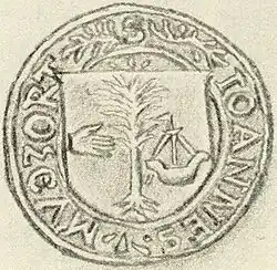 | Wappen: Burg mit drei Türmen, aus dem mittleren Turm ragt ein angewinkelter geharnischter rechter Arm ein Schwert haltend in Silber | |