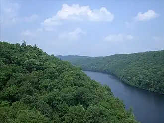 ![]() Blick auf den im Piney Reservoir gestauten Clarion River von einer Brücke der Interstate 80 aus gesehen | ||