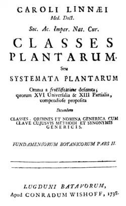 Classes Plantarum ist eine detaillierte Ausarbeitung der im zweiten Kapitel (Systemata) von Fundamenta Botanica aufgestellten Aphorismen 53 bis 77.[1]