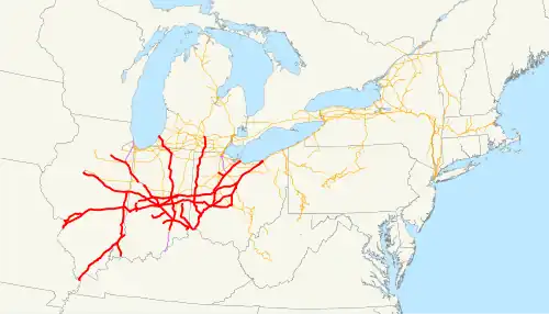 - die Cincinnati, Wabash and Michigan Railway in Indiana und Michigan.