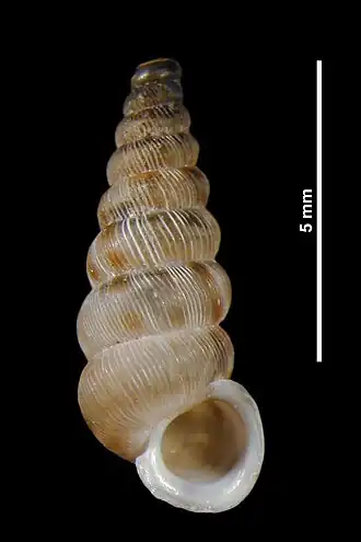 Das rechtsgewundene Gehäuse ist 7,3 bis 7,5 mm hoch und 2 bis 2,8 mm breit. Es ist schlank-turmförmig und hat 10,5 Windungen, die langsam und gleichmäßig zunehmen. Die Windungen sind gut gewölbt und werden von einer deutlichen Naht voneinander abgesetzt. Der letzte Umgang ist an der Basis gerundet, nicht gekantet. Die ersten 2,5 Windungen sind glatt, die restlichen Umgänge regelmäßig berippt, die Rippen stehen in weiten Abständen. Auf der letzten Windung werden die Rippen feiner.