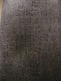 Der rund 3800 Jahre alte Text des Codex Hammurapi ist vor allem durch die heute im Louvre (Département des Antiquités orientales, Inventarnummer Sb 8) befindliche Stele aus Diorit bekannt. Diese wurde im Winter 1901/1902 von Gustave Jéquier und Jean-Vincent Scheil während einer französischen Expedition nach Persien unter der Leitung von Jacques de Morgan auf der Akropolis von Susa in drei Bruchstücken gefunden. Bereits im April 1902 wurden diese, wieder zu einer Stele zusammengesetzt, in das Pariser Museum verbracht und ihre Inschrift noch im selben Jahr von Jean-Vincent Scheil ediert und ins Französische übersetzt.[2] Dabei legte Scheil eine Paragrafennummerierung fest, die sich am Einleitungswort šumma (deutsch: „wenn“) orientierte, was für den Text eine Gesamtzahl von 282 Paragrafen ergab – eine Zählung, die bis heute verwendet wird.[3] Im selben Jahr folgte auch die erste deutsche Übersetzung durch Hugo Winckler, der Scheils Paragrafeneinteilung übernahm.[4]