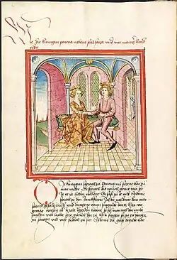 - ↑ Henrike Lähnemann: Pontus und Sidonia. Literarhistorische Einführung und Beschreibung der Handschrift [Cpg 142] (Online (PDF), Manuscripta Mediaevalia). Teil von: Pontus und Sidonia. Farbmikrofiche-Edition der Handschrift Heidelberg, Universitätsbibliothek, Cod. Pal. germ. 142 (=Codices illuminati medii aevi 52). Edition Helga Lengenfelder, München 1999, ISBN 3-89219-052-6, S. 22.