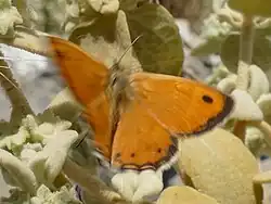 Die Falter beider Geschlechter sehen fast gleich aus und ähneln dem Kleinen Wiesenvögelchen (Coenonympha pamphilus). Sie haben bräunliche ockerfarbene oder leicht ins orange gehende Flügeloberseiten mit einem nicht scharf abgegrenzten, dunkelbraunen Rand und einem verwaschenen, dunklen Punkt nahe der Spitze (Apex) des Vorderflügels. Die Hinterflügelunterseiten sind variabel, weißgelb, grau oder bräunlich gefärbt und haben eine helle Querbinde. Die Unterseiten der Vorderflügel sind kräftiger orange gefärbt und haben einen weiß gekernten und hell umrandeten Augenfleck nahe der Flügelspitze.