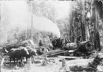 ![]() Stämmen auf die Tramway der Coffs Harbour Timber Co. Die Ochsen Bright and Lively beim Umladen von Eukalyptus- Stämmen auf die Tramway der Coffs Harbour Timber Co. | |
