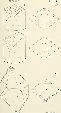 Bereits Abraham Wendell Jackson hatte 1884 festgestellt, dass alle Colemanit-Kristalle von der Typlokalität eine hochkomplexe Kristalltracht besitzen und einer der Kristalle nicht weniger als 24 verschiedene Kristallformen aufweist.[32] Jackson hat überhaupt als erster Colemanit-Kristalle aus Kalifornien untersucht.[33] Hier bildete er Zeichnungen von zehn verschiedenen Kristallen ab, zu denen die in der nebenstehenden Tafel gehören. Er ordnete die immer mittel- bis kurzsäuligen Kristalle drei verschiedenen Habitusvarianten zu. Allerdings hat er erst später erfahren, dass das von ihm untersuchte Material in nur untergeordnetem Maße von der Typlokalität, sondern hauptsächlich aus Lagerstätten aus dem fünf Meilen von Daggett (Kalifornien) entfernten Calico District[34] in den Calico Mountains in der Mojave-Wüste, San Bernardino County, Kalifornien, stammte.