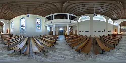 In den Jahren 1880 bis 1894 sowie 1912 war die schlichte Dekoration der Bauzeit durch eine historisierende Einrichtung ersetzt worden. 1956 wurde unter dem damaligen Rektor Robert Schlund das monumentale Wandbild von Richard Seewald an der Stirnseite geschaffen. Das Bild zeigt Christus mit Schriftrolle in richtender Geste.