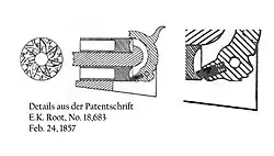 Bei der ersten von E. K. Root entwickelten Waffe (Root’s Patent Dec. 25, 1855) wird die Trommel nicht über den hinten an der Trommel liegenden Zahnkranz in die nächste Schussposition gebracht, sondern durch einen Stift, der in die auf der Außenfläche der Trommel eingefrästen Nuten greift. Der Stift ist Teil des Abzugs. Schiebt man den Abzug nach vorn und zurück, so dreht sich die Trommel, die nächste geladene Kammer wird in Schussposition gebracht und der nächste Schuss wird ausgelöst.
