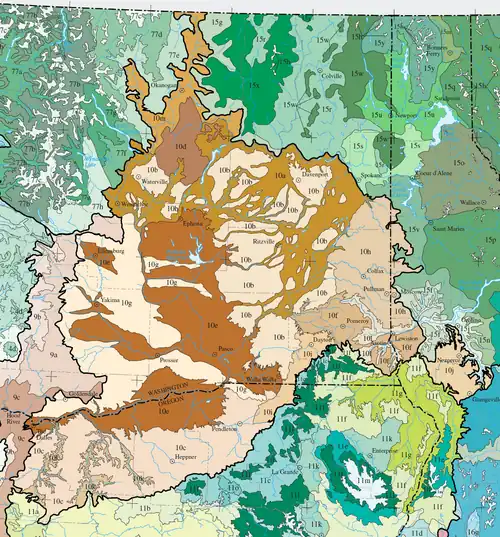 Die Ökoregion Columbia Plateau ist nach der Klassifikation der United States Environmental Protection Agency (EPA) eine Ökoregion des Levels III in den US-Bundesstaaten Oregon und Washington sowie kleinen Gebieten in Idaho. Die Ökoregion erstreckt sich über weite Bereiche des Einzugsgebiets des Columbia River von The Dalles (Oregon) über Lewiston (Idaho) bis Okanogan (Washington) nahe der Grenze zwischen Kanada und den Vereinigten Staaten. Sie umfasst etwa 500 mi (ca. 800 km) des Laufs des Columbia River sowie die Unterläufe seiner Hauptzuflüsse wie Snake River und Yakima River sowie außerdem die damit assoziierten Einzugsgebiete. Sie ist nach dem Columbia River Plateau benannt, einem Plateau aus Flutbasalt, das vom Columbia-Plateaubasalt während des späten Miozäns und des frühen Pliozäns gebildet wurde. Die ariden Salbei-Strauchsteppen und Grasländer der Region werden auf allen Seiten von feuchteren, vorwiegend bewaldeten, bergigen Ökoregionen flankiert. Grundgestein ist Basalt, der bis zu 2 mi (3,2 km) dick und teilweise von mächtigen Löss-Ablagerungen bedeckt ist.[1] Wo die Niederschlagsmengen ausreichend sind, wurden die tiefen Löss-Böden für den Weizen-Anbau intensiv kultiviert. Das Wasser aus dem Columbia River ist Gegenstand von Debatten über die Ressourcennutzung, wobei Fischerei, Schifffahrt, Wasserkraftnutzung, Erholung und Bewässerung einbezogen werden. Das Columbia Basin Project hat einen Großteil der Region dramatisch verändert, indem es die Landwirtschaft teilweise erst ermöglichte.[1][2][3]