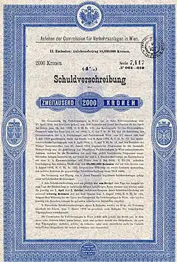 Die Geldbeschaffung fand kumulativ für alle drei Teilbereiche statt. Sie erfolgte durch die Emission der mit vier Prozent verzinslichen „Wiener Verkehrsanlagen-Anleihe“. Die Commission für Verkehrsanlagen war berechtigt, die zur Finanzierung nötigen Anleihen auf bis zu 90 Jahre aufzunehmen. 1898, im Eröffnungsjahr der Stadtbahn, betrug ihr nominelles Anlagekapital 104.239.122 österreichische Kronen.[4]