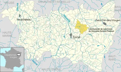 Die Communauté de communes de l’Arentèle-Durbion-Padozel war ein kommunaler Zusammenschluss von zwölf Gemeinden nordöstlich von Épinal im Département Vosges in Lothringen.