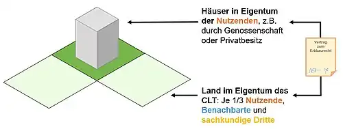 Community Land Trusts bestehen aus variierenden Körperschaftsformen, die treuhänderisch Grundstücke und vereinzelt Gebäude halten und für deren Nutzung einen Erbbauzins oder vergleichbare Beiträge erheben. Diese Abgabe wird von den Eigentümern der auf den Grundstücken liegenden Gebäude erhoben und dient zur nicht-gewinnorientierten Nutzung und Weitergabe der Grundstücke.[2] Der abgeschlossene Erbbauvertrag wird für gewöhnlich auf 99 Jahre ausgelegt.[1] Zentrale Elemente eines CLT sollen die Verwaltung und Eigentum durch lokale Gemeinschaften, offene Beteiligungsstrukturen, Preisstabilität, Gemeinnützigkeit und eine langfristige Ausrichtung sein.[2] Wesentlich ist die rechtliche Absicherung der Unverkäuflichkeit sowie die Gemeinwohlorientierung der verwalteten Liegenschaften.[3] Dabei sind die Berücksichtigung der lokalen Besonderheiten, eine nachbarschaftliche Verankerung und genaue Definition der Zielgruppen definierend.[4] In der Regel sind Vorstände der CLT oder zentrale Entscheidungsorgane paritätisch zu einem Drittel aus den Bewohnenden, den umliegenden Nachbarschaften und sachkundigen Personen aus CLT, Wissenschaften oder des öffentlichen Lebens besetzt. Der Vorstand arbeitet meist ehrenamtlich. Die Anstoßfinanzierung von CLT erfolgt durch Spenden, Mitgliedsbeiträge, Zustiftungen, Projektförderungen oder Nachlässe (Erbschaftsspenden) von Kapital oder Grundstücken.