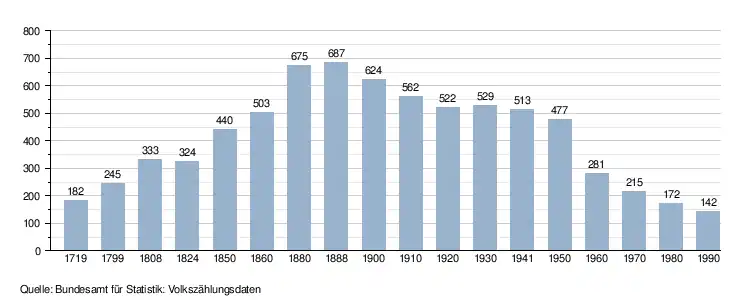 - ↑ Daten der Eidgenössischen Volkszählungen ab 1850 nach Gemeinden. (XLSX; 10 MB) Bundesamt für Statistik, Neuchâtel, 12. Juli 2024, abgerufen am 4. Februar 2025 (Öffnung in Excel nur über "Anhang/Excel-Datensatz" möglich).