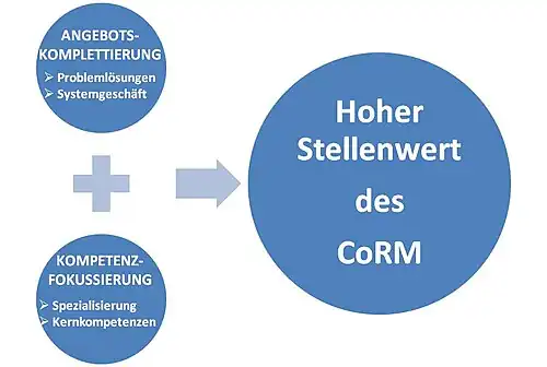 In Anlehnung an die etablierten Sparten des Business Relationship Management (insb. das Customer- und Supplier-Relationship Management, kurz CRM und SRM) wird das Complementor Relationship Management als CoRM abgekürzt. Es handelt sich um eine relativ junge Sparte des Beziehungsmanagements. Den Ursprung des Geschäftsbeziehungsmanagement bildet das SRM.[5]