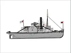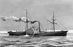 Die Konföderation war zudem mit ihrem Bemühungen nach Erwerb zusätzlichem Schiffsraums nicht allein. Die Vereinigten Staaten waren ebenfalls nicht untätig und kauften zu diesem Zweck alle in Kanada verfügbaren Dampfschiffe auf.[40] Nach der Sezession Virginias begann das Marineministerium mit der Eingliederung der Seestreitkräfte der Bundesstaaten in eine gemeinsame Marine. Im Lauf des Krieges nahm sie etwa 500 Schiffe in ihren Dienst, dabei handelte es sich aber zum größten Teil um kleinere Küsten- oder Flussdampfer, die den Unionsschiffen im Ernstfall nichts entgegenzusetzen hatten.[4] Aktive/im Dienst befindliche Marineschiffe trugen den Namenszusatz "CSS" (Confederate State Ship = Schiff der Konföderierten Staaten). Bis zum November des Jahres 1861 hatte die Konföderation schon mehrere Schiffe, darunter die Sumter und die Virginia in Dienst gestellt. Letztere war das erste auf dem amerikanischen Kontinent konstruierte Panzerschiff.
